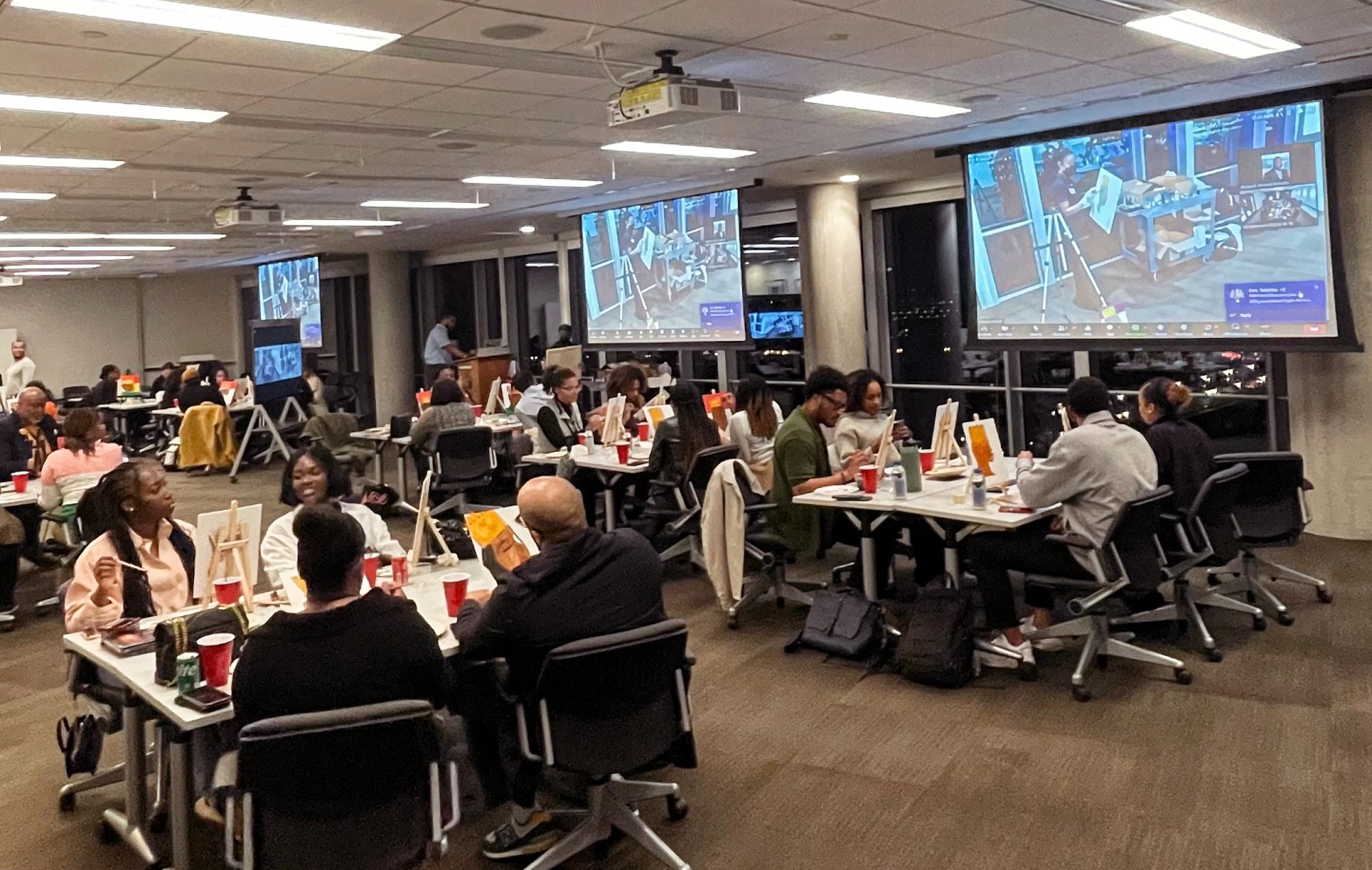 Includes art supplies. Customers are given acrylic paint, canvases, easels, palettes, cups, and brushes. Let us know if you will need aprons, table covers, or shipping. Please provide your own alcohol. Instruction takes approximately two hours or less.